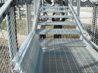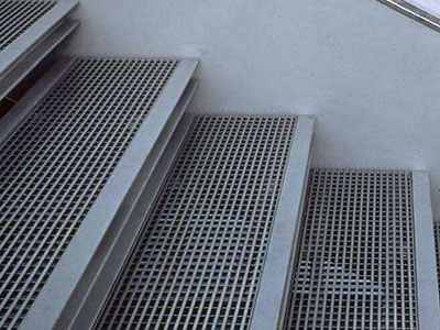 樓梯鋼格板是由鋼格板加工而成的(鋼格板是用扁鋼按照一定的間距和橫桿進行交叉排列,并且焊接成中間帶有方形格子的一種鋼鐵制品)。該產(chǎn)品表面一般用熱鍍鋅、電鍍鋅處理。